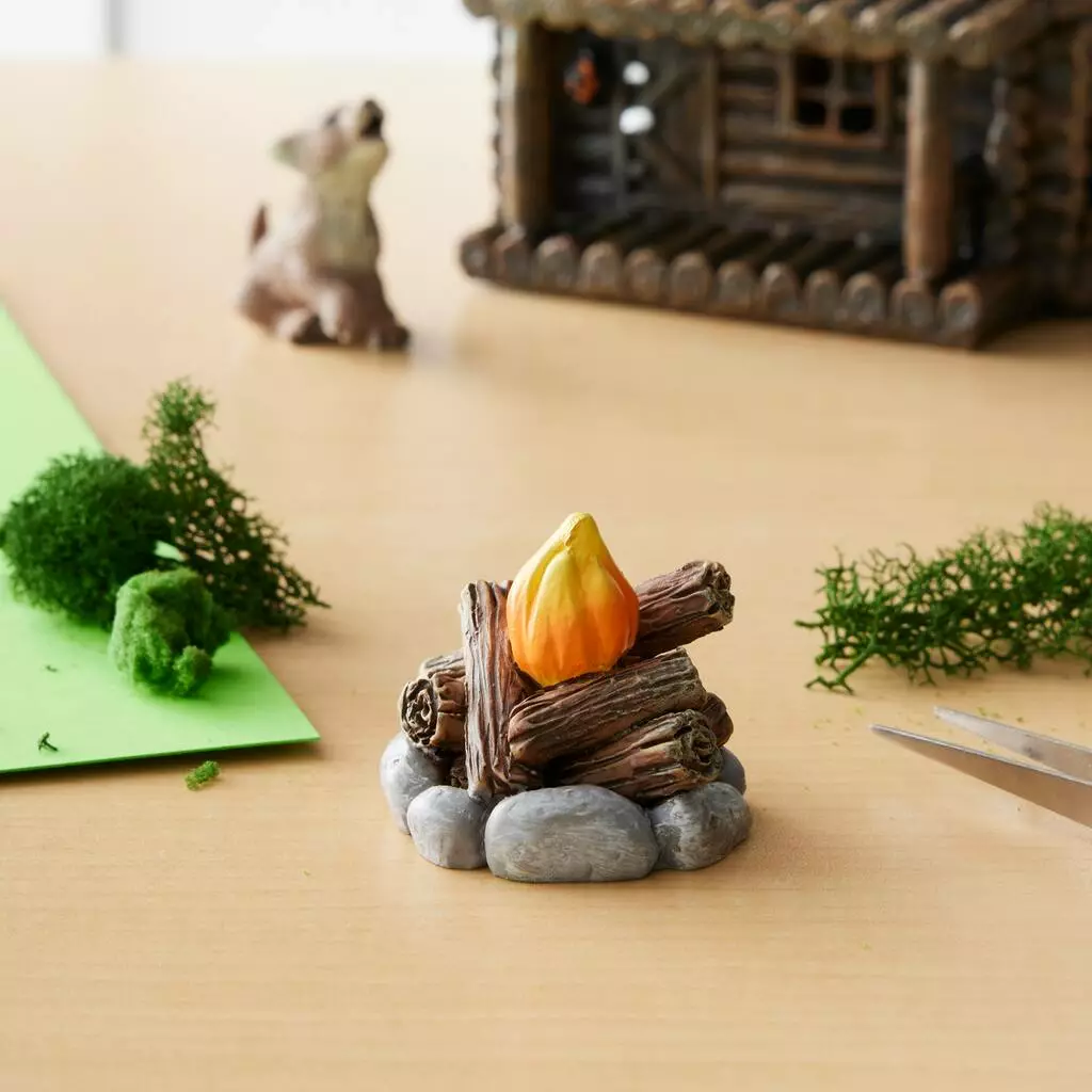 Create a charming nighttime scene set in the great outdoors using this miniature campfire model. Place with campers, evergreens and forest critters alongside a waterfall to complete the setting.