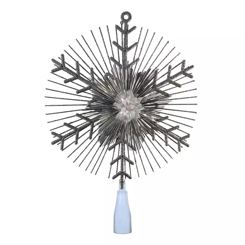 This stunning silver tree topper will bring a wonderful enchanting shimmer to your holiday tree. With a lovely tinsel starburst design accented by glitter and clear sparkling lights, this piece will give a fantastic, festive finish to your Christmas decorating.