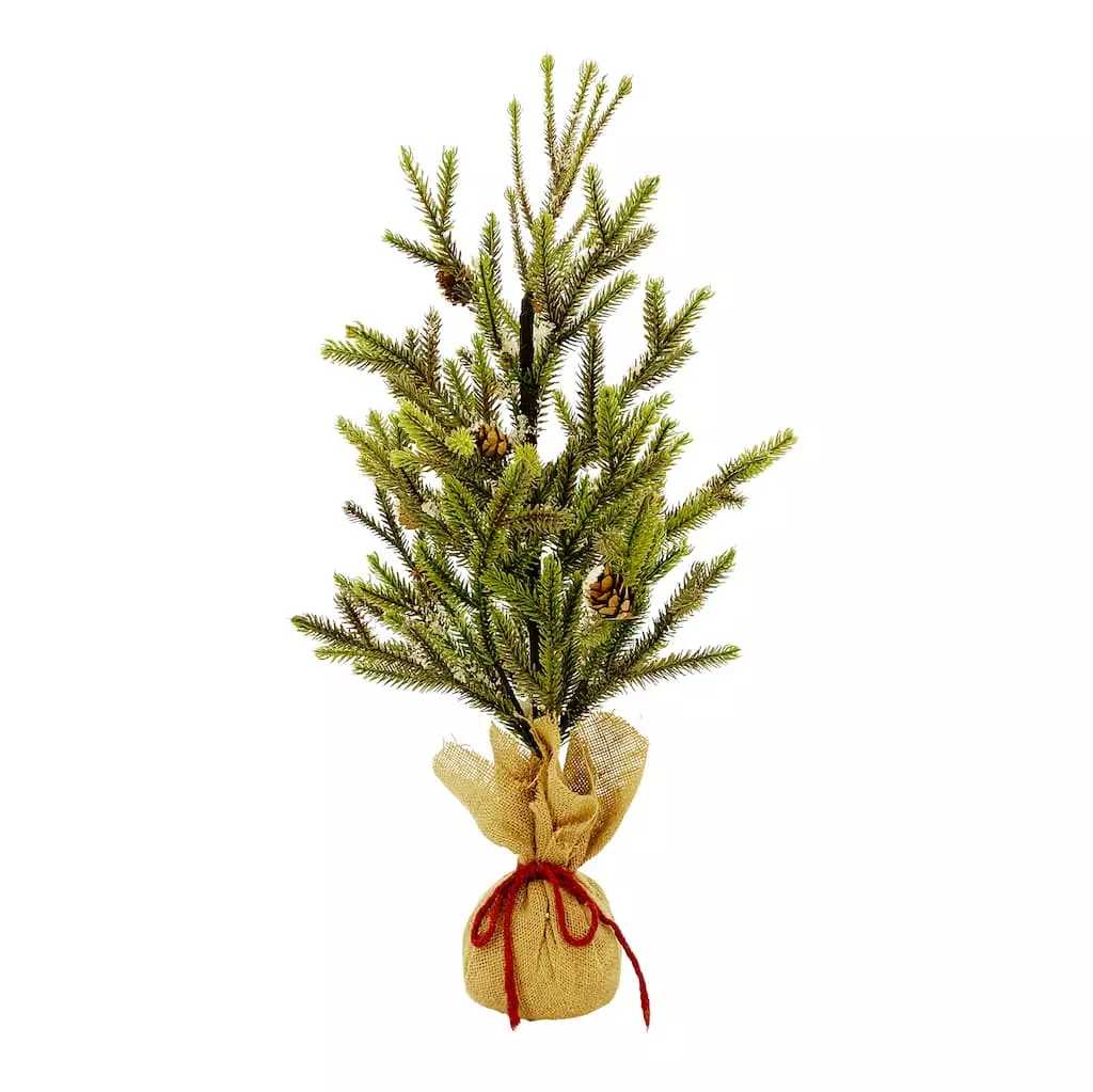 Bring Christmas cheer to spaces throughout your home with this artificial pine accent tree potted in a charming burlap bag. Embellished with pinecones and a red bow, this tree will look wonderful as is or add a string of sparkling lights and little ornaments to give it a little extra flair. Place on a side table nestled in faux snow alongside rustic wooden animal figurines and a festive tabletop sign for an extra touch of holiday magic.