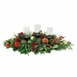 This pine and ornament candle holder arrangement is perfect for lending your home a touch of Christmas. Fill each holder with a pillar candle to create an ambient holiday glow.