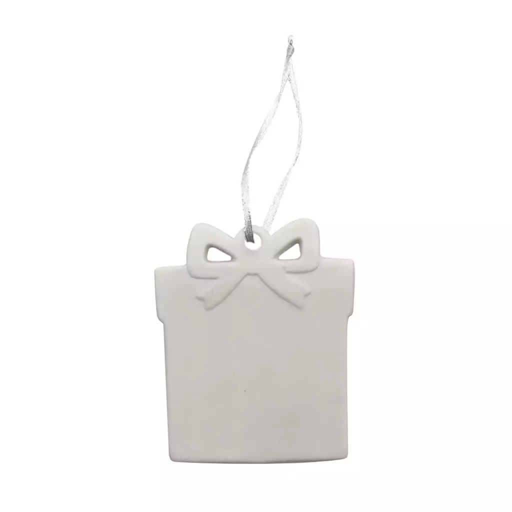 Add your own special flourish to your holiday tree with this unfinished ceramic Christmas ornament, featuring a wrapped present design. Use your imagination to give this piece a fun festive touch using paint, glitter, ribbon and more!
