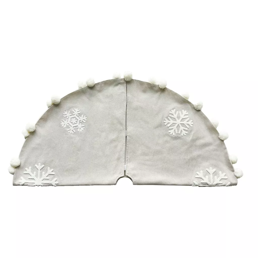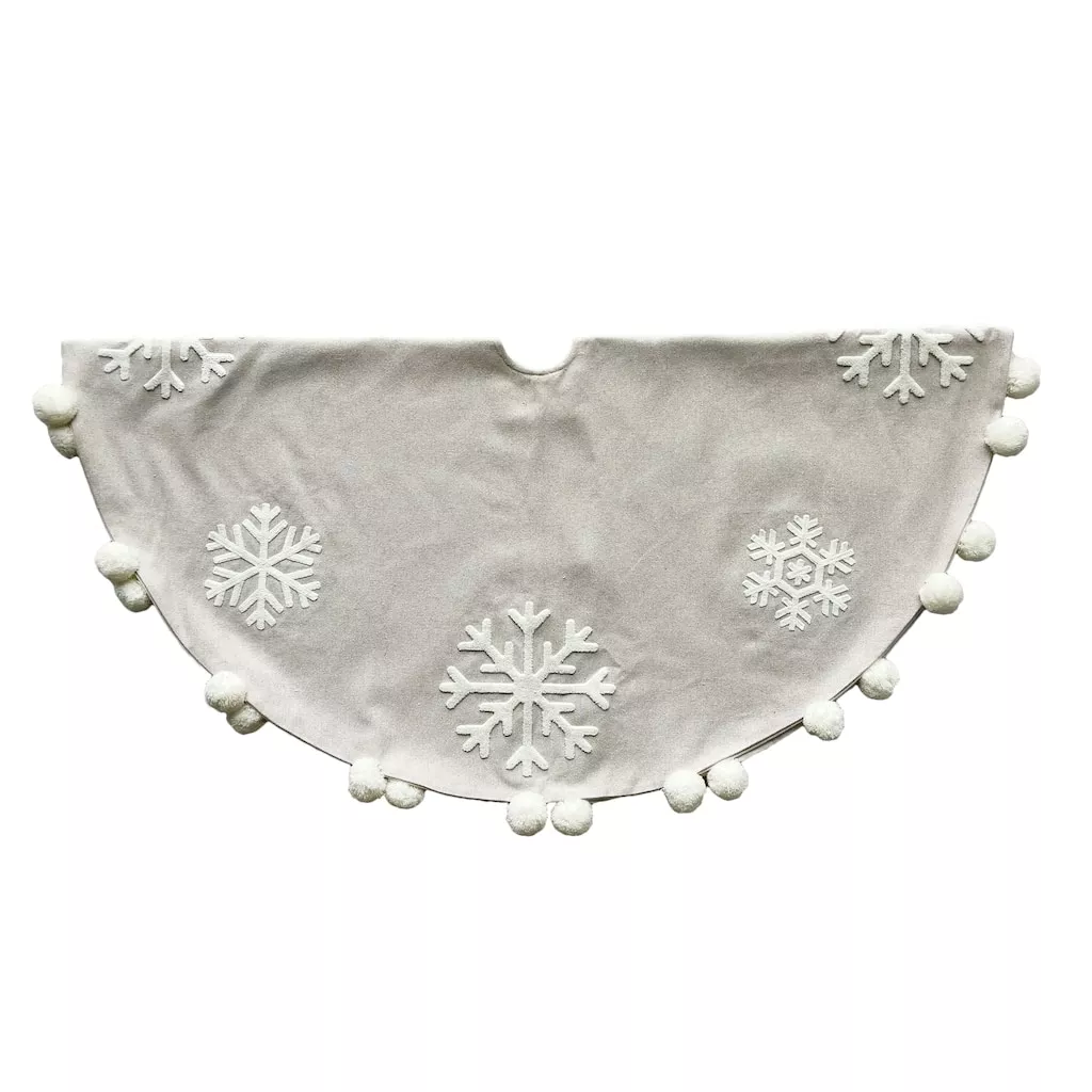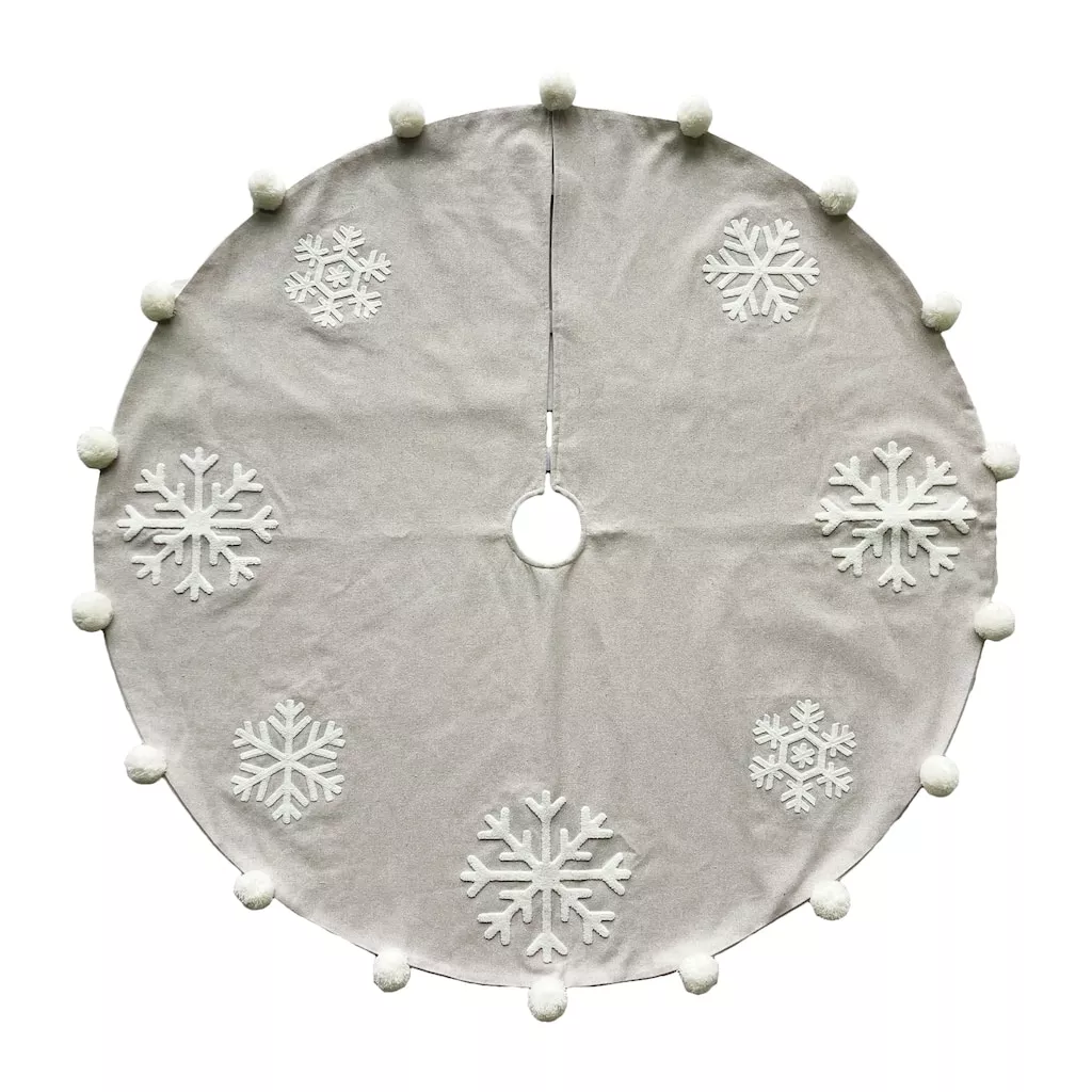 This snowflake tree skirt with pom poms is guaranteed to complement your tree. Team it with ornaments and lights for the perfect holiday display.