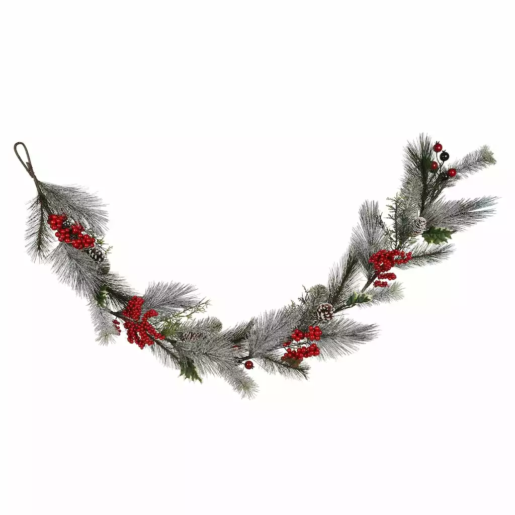 Give your holiday decorating a lovely touch of festive greenery with this garland of snowy pine and red berries. Embellish with sparkling clear lights and ribbon or display as is draped over a doorway, window frame, mantel or bannister to bring a little magic into your home this Christmas.