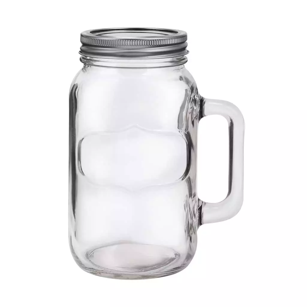 A nice reminder of warm summer days from the distant past, this casual drinking glass looks like a canning jar with a handle. It’s perfect for outdoor weddings and holiday picnics. The lid helps keep your drink cool and prevents spilling. The embossed area on one side is perfect for decorating with chalkboard paint, a decorative label or etched initials.