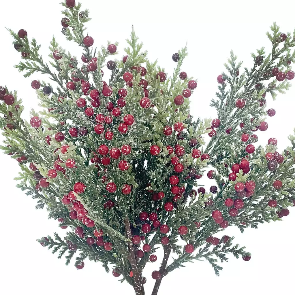 This festive juniper spray features bright red holly berries and glitter accents. Use it to add Christmas flair as you create wreaths and floral arrangements or as an element of your holiday decorating theme.