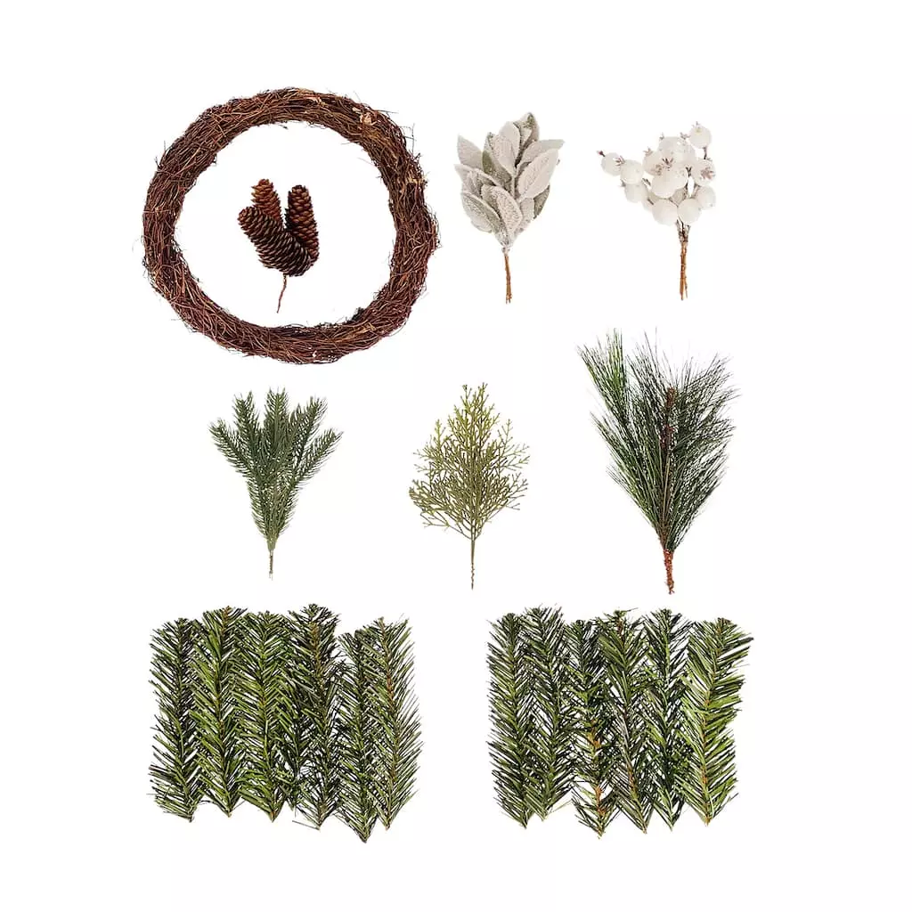 - 1 grapevine wreath base with pine needle branches pine picks