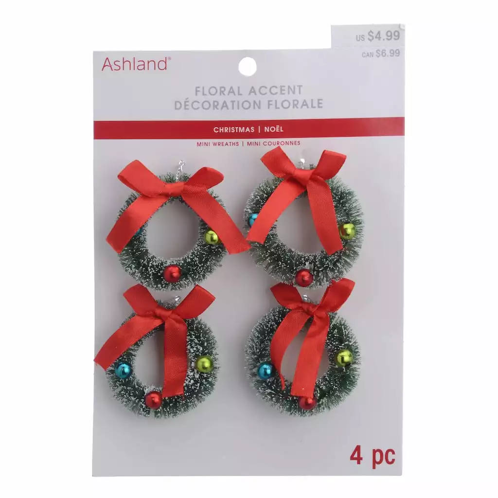 Hang these tiny wreaths on your Christmas tree to add bright sparkle to your holiday décor. The bright red bow and ball ornaments will go with any traditional decorations.