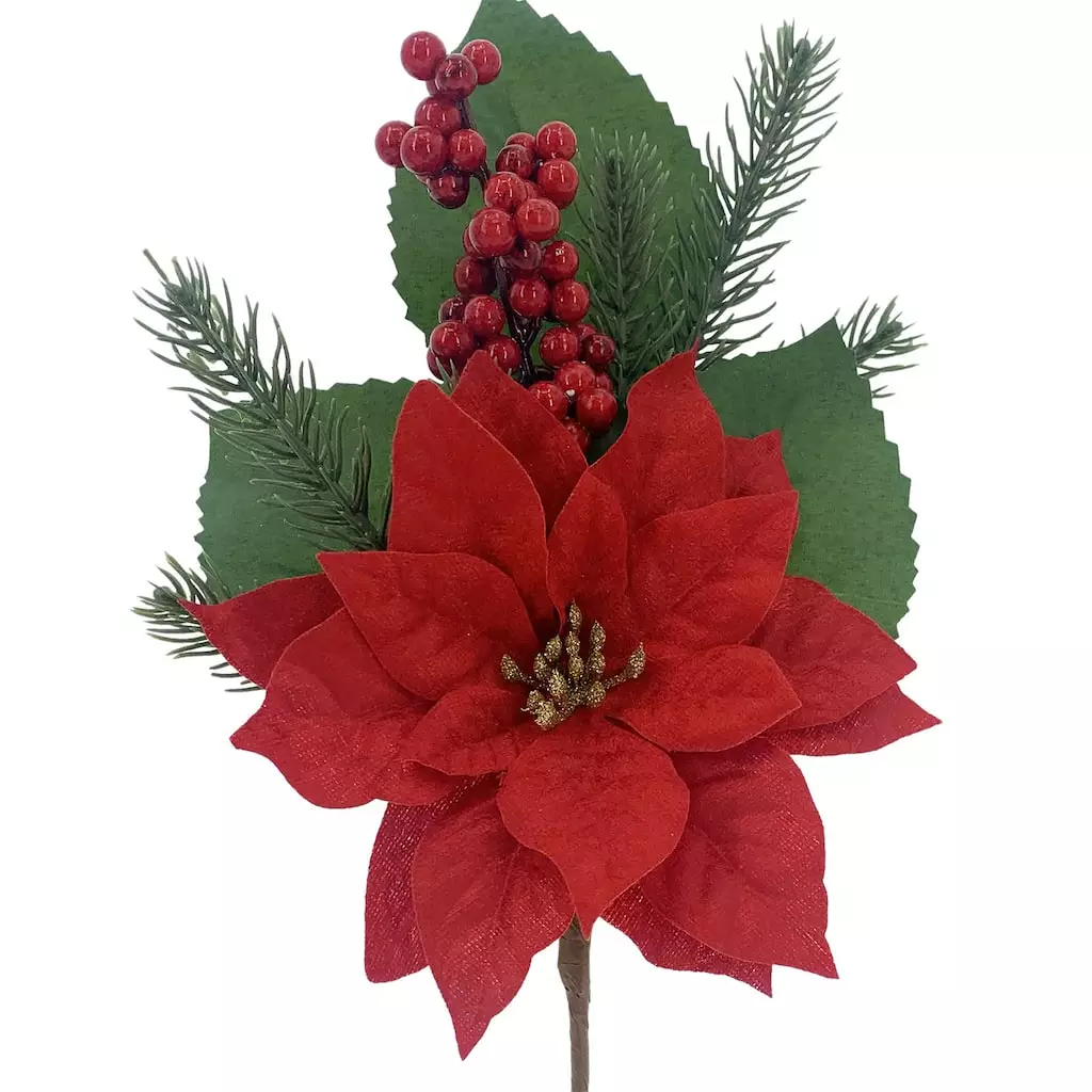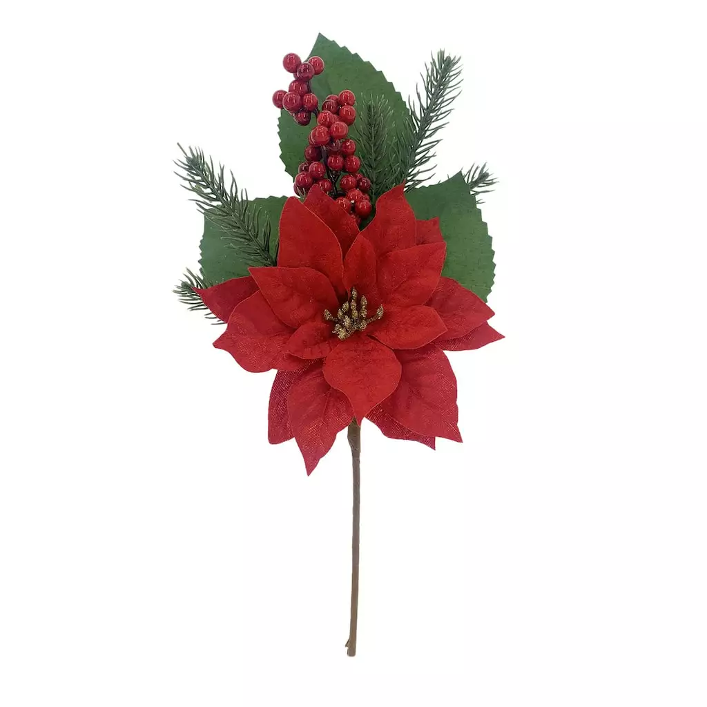 Decorate your home with this beautiful poinsettia and berry pick by Ashland. It will look lovely for the holiday season in a vase full of greenery.