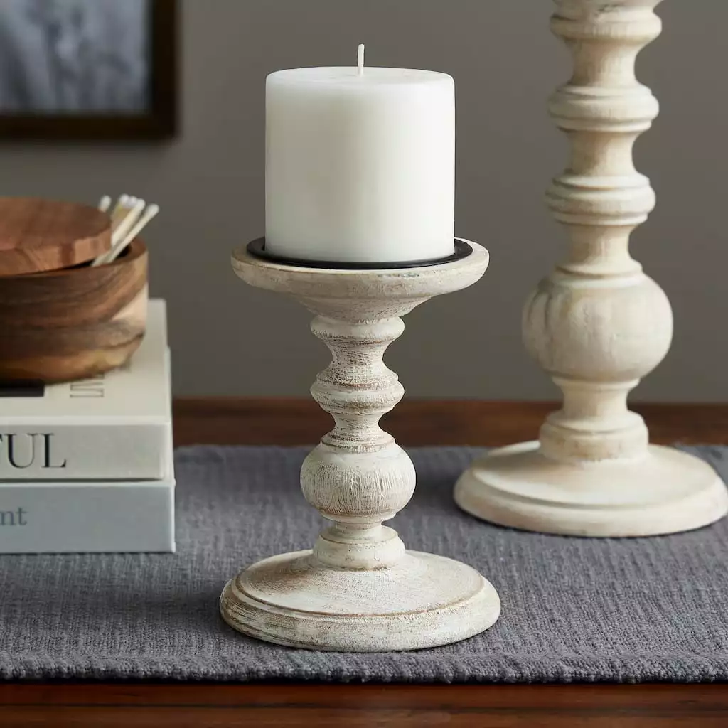 This whitewashed pillar candle holder will look lovely on a mantle. Team it with a vase of dried floral stems to add create a beautiful setup in your living room.